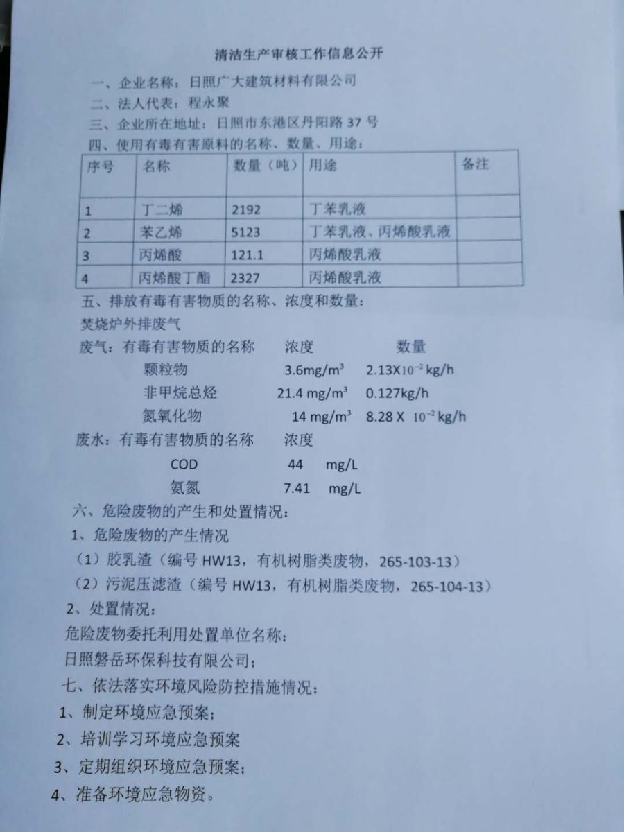 日照廣大建筑材料有限公司,位于風(fēng)景秀麗的海濱城市山東日照,成立于1988年,是專業(yè)生產(chǎn)高分子化工產(chǎn)品,集科研開發(fā)、生產(chǎn)經(jīng)營(yíng)為一體的化工企業(yè),主要產(chǎn)品為丙烯酸脂類乳液和丁苯膠乳。是國(guó)內(nèi)目前江北同行業(yè)產(chǎn)銷量最大企業(yè)之一。